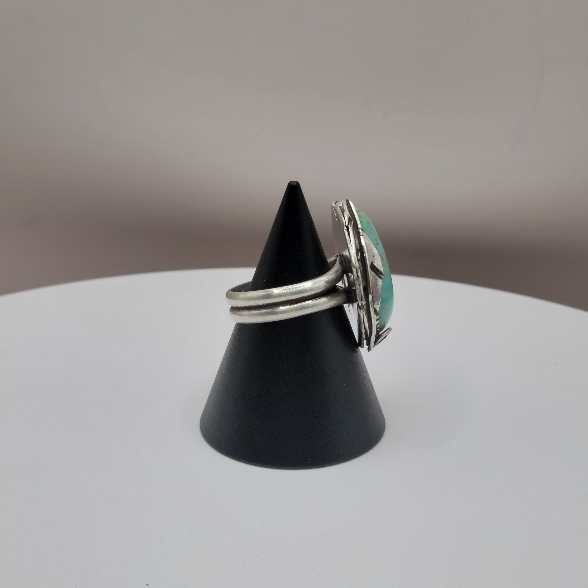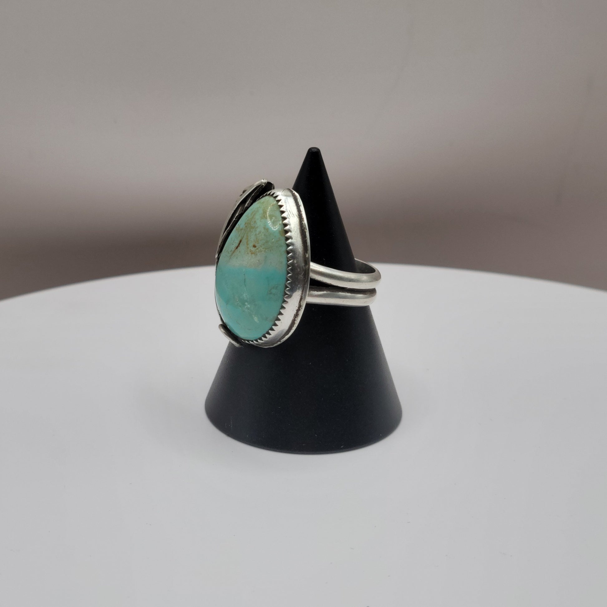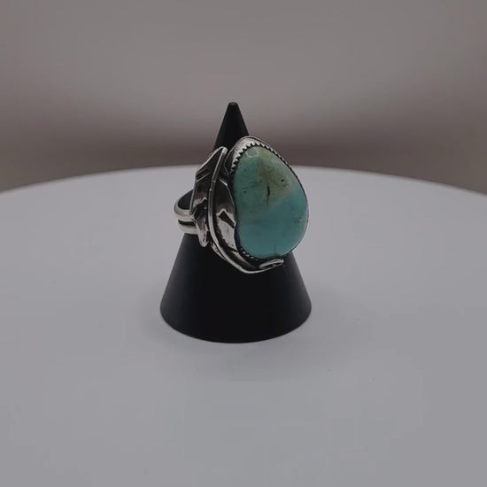 Add a touch of whimsy to your outfit with this handmade Kingman Turquoise Sterling Silver Feather Ring. Each leaf is carefully crafted from scratch by rolling sheet and drawing wire. The stunning Old Stock Kingman Turquoise cab is unbacked and thick, adding to its unique charm.