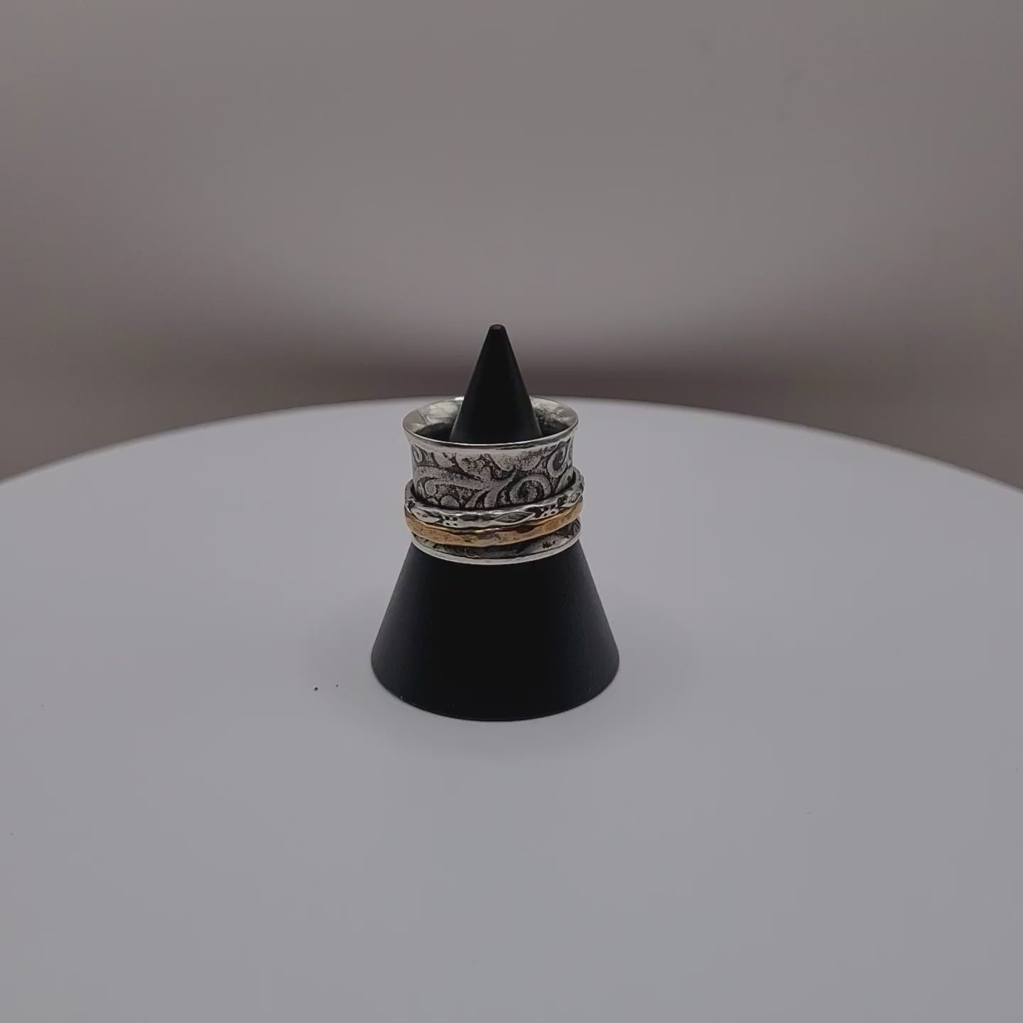 This luxurious piece combines the richness of nordic gold and the elegance of sterling silver. The rotating bands create a mesmerizing effect, making it an exquisite addition to any jewelry collection.
